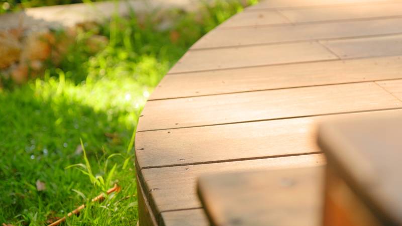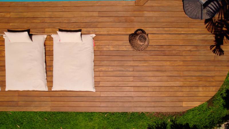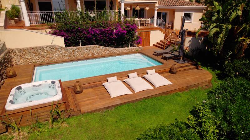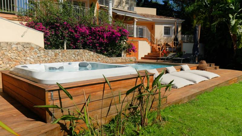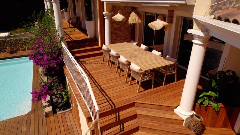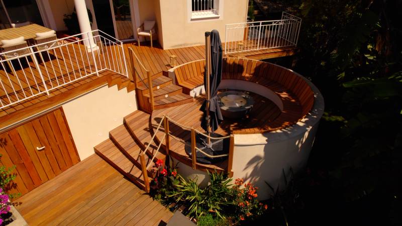 Réalisation à Mandelieu La Napoule (Alpes Maritimes) prés de Cannes, d'une terrasse en bois exotique Cumaru, bois particulièrement adapté au climat de bord de mer. Le bois exotique marie élégance et durabilité. La terrasse en bois exotique, réalisée ici à Mandelieu La Napoule, entoure la piscine et le jacuzzi créant ainsi un bel espace détente. Cette réalisation incarne notre engagement à utiliser uniquement des matériaux de qualité supérieure pour vos projets. À Mandelieu La Napoule et dans les Alpes Maritimes, Bekowood Diffusion conçoit des terrasses et aménagements en bois sur mesure, ajoutant valeur et confort à votre espace extérieur.