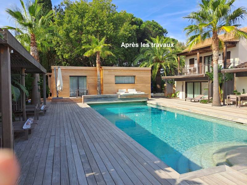 Concernant les aménagements extérieurs de l'hôtel Villa Cosy à Saint Tropez, la terrasse en bois exotique en ipé de la piscine a été intégralement poncée, dégrisée et retraitée avec un saturateur huilé.